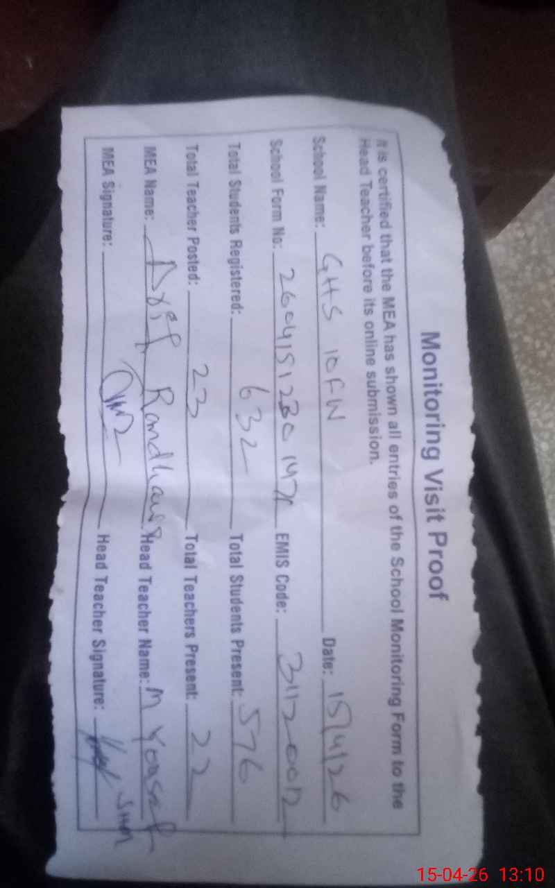 | EMIS Code: 31120012 | Name of School: GHS CHAK NO. 10/FW | |||