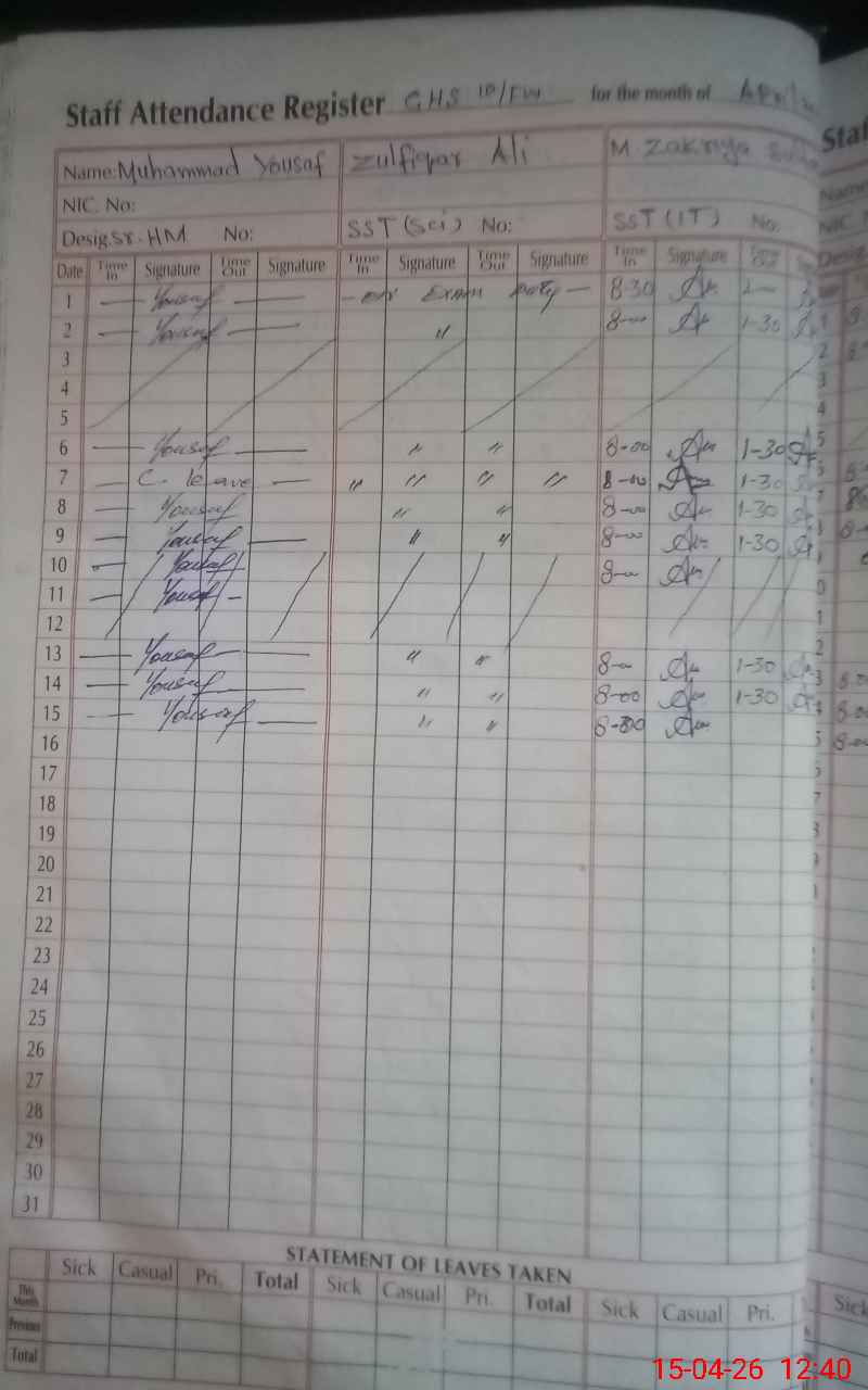 | CNIC | Full Name | Designation | R/C | Absence During Last Calender Month |