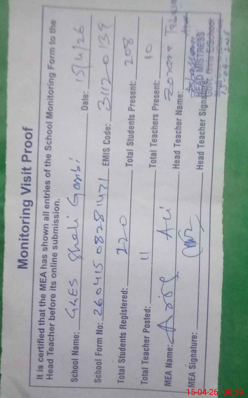 | Attendance Register | Head Teacher | MEA with School | Visit Proof |