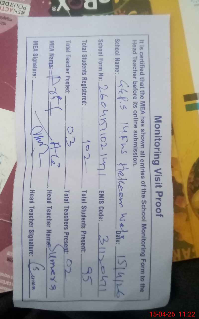 | Attendance Register | Head Teacher | MEA with School | Visit Proof |