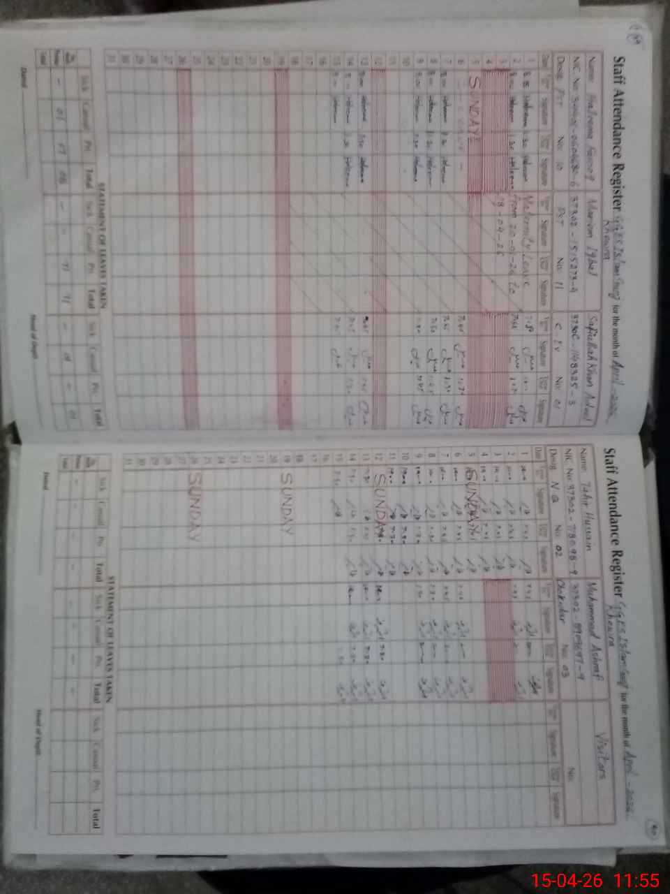 | CNIC | Full Name | Designation | R/C | Absence During Last Calender Month |