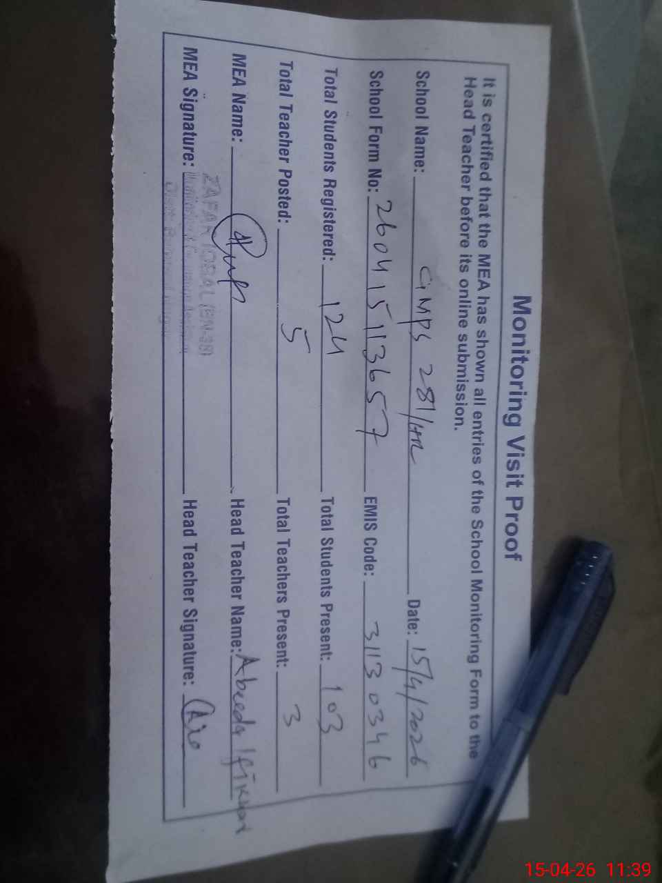 | Attendance Register | Head Teacher | MEA with School | Visit Proof |