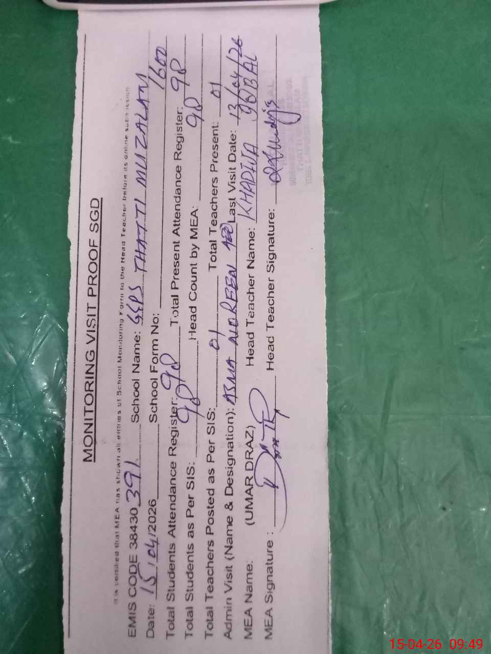 | Attendance Register | Head Teacher | MEA with School | Visit Proof |