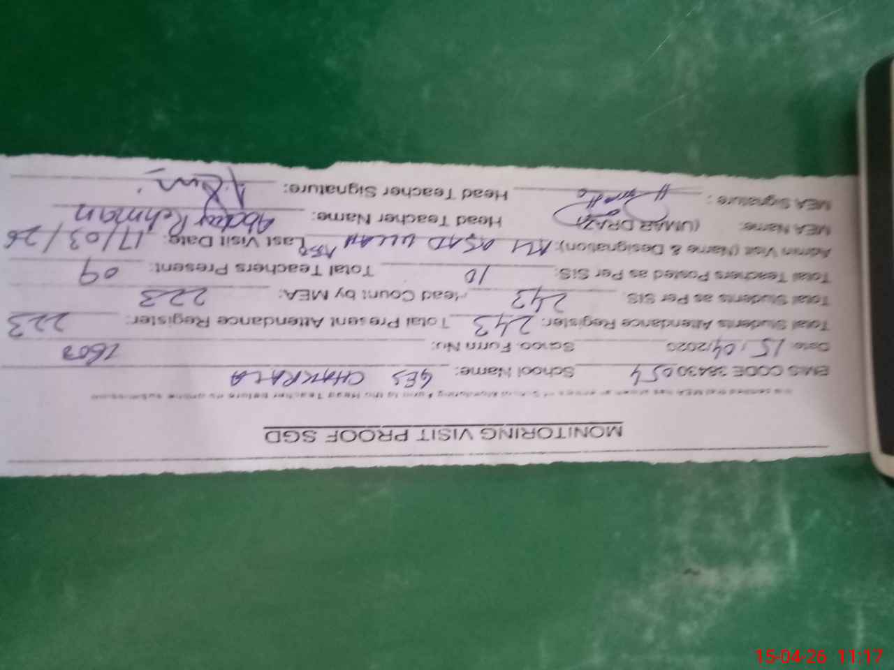 | Attendance Register | Head Teacher | MEA with School | Visit Proof |