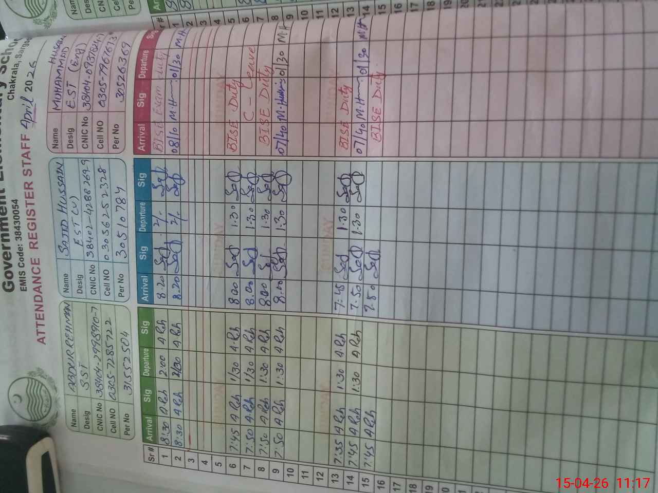 | CNIC | Full Name | Designation | R/C | Absence during last cal. month |