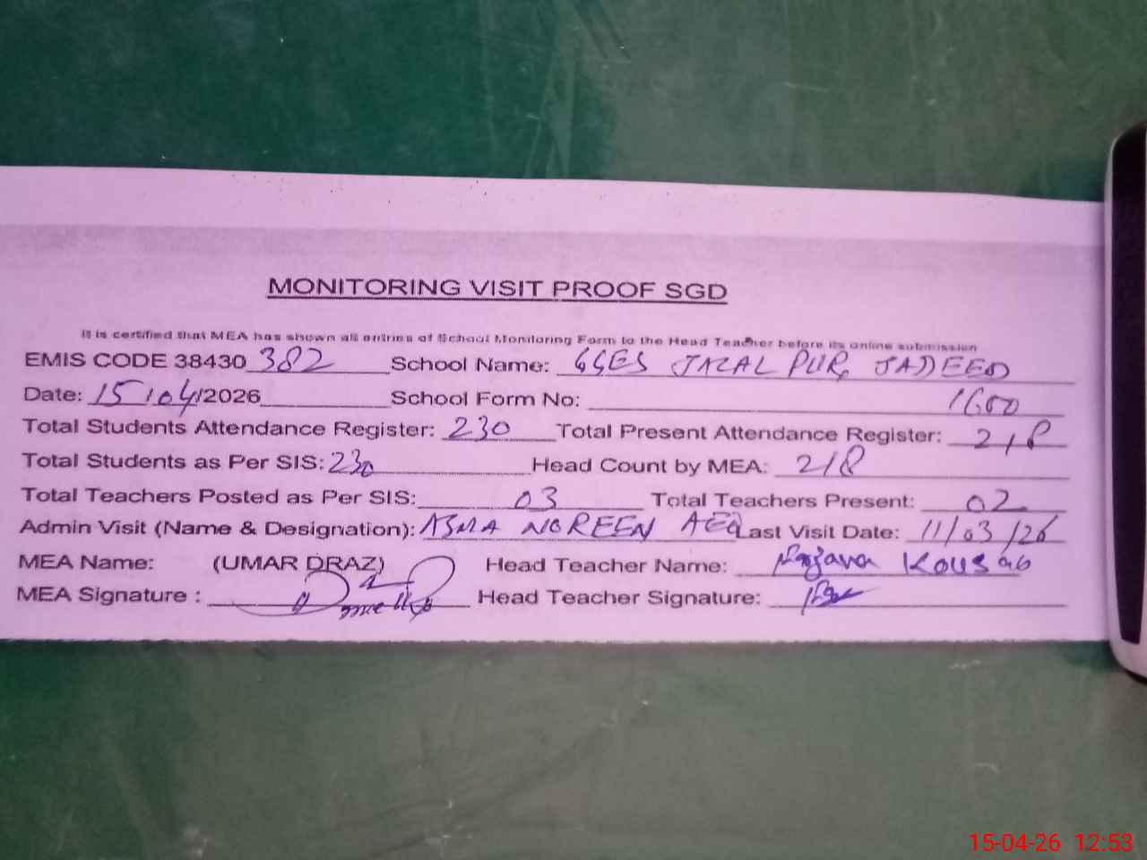 | Attendance Register | Head Teacher | MEA with School | Visit Proof |