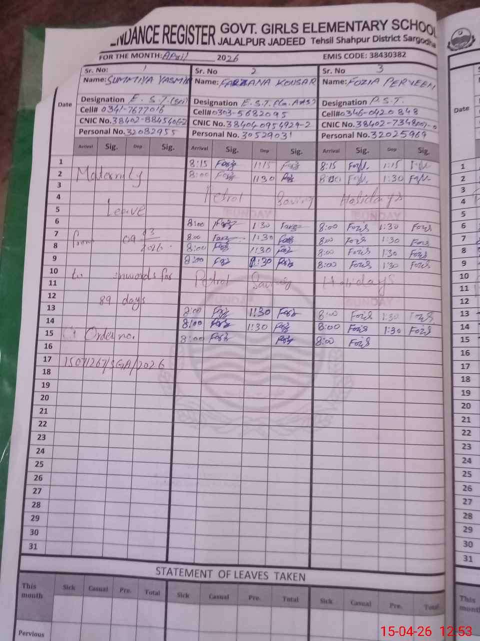 | CNIC | Full Name | Designation | R/C | Absence During Last Calender Month |