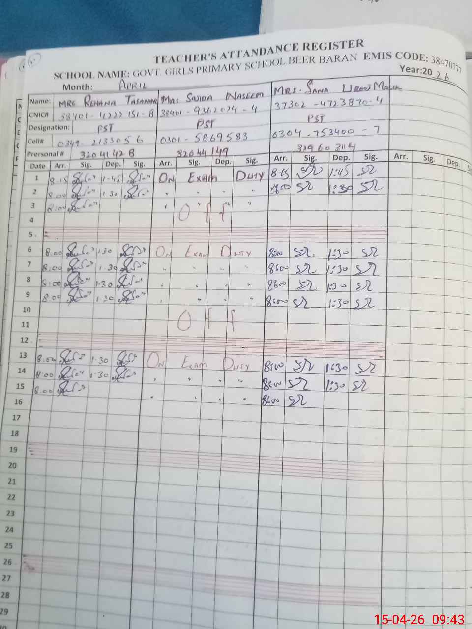 | 38**** | Sa**** Na**** | PST Science/Maths | Regular | 0 | 0 | 0 | 0 | 0 | 0 | 0 | 0 | 0 | Exam Duty |