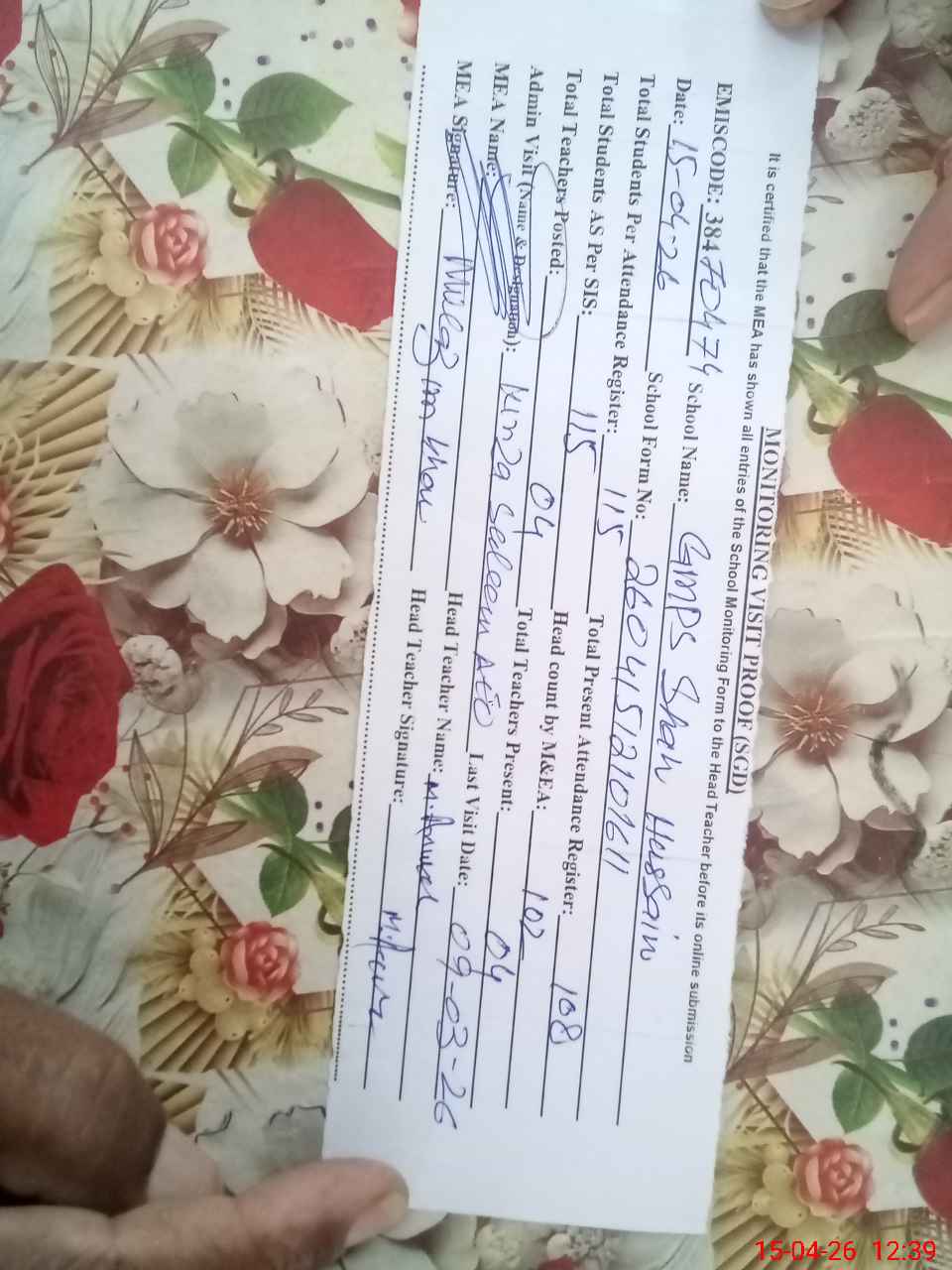 | Attendance Register | Head Teacher | MEA with School | Visit Proof |