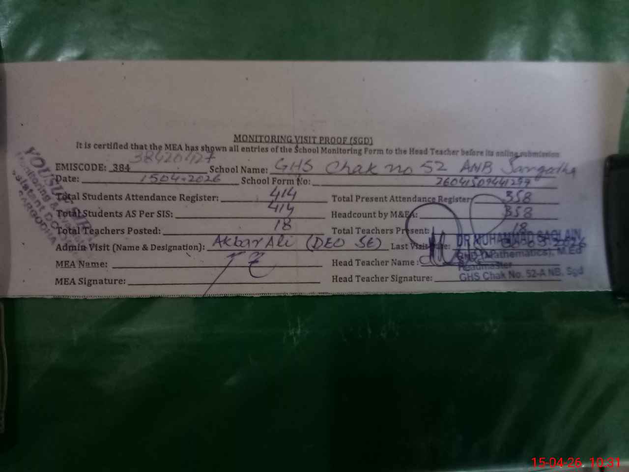 | EMIS Code: 38420427 | Name of School: GHS CHAK NO.52 ANB | |||