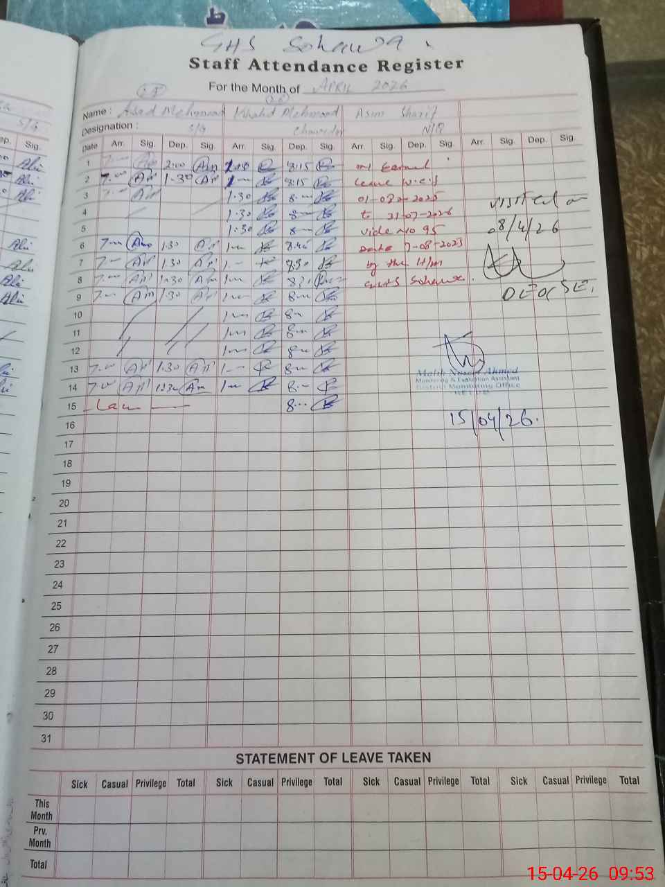 | Monitoring Date: 15-04-2026 | Start Time: 15-04-2026 09:02 AM | End Time: 15-04-2026 09:55 AM | Name of MEA: Na**** Ah**** | |