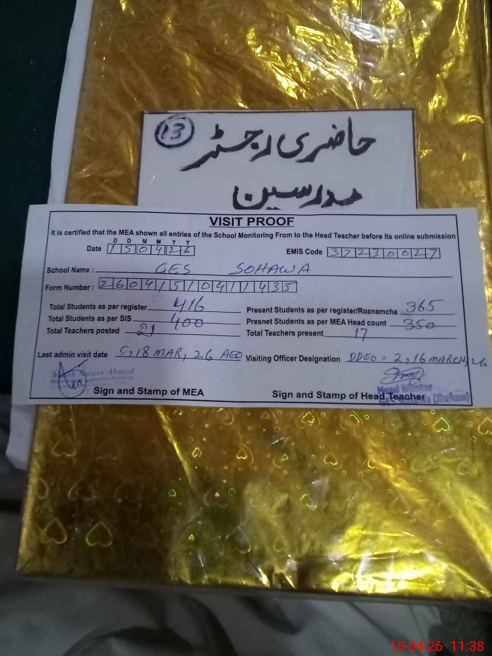 | Attendance Register | Head Teacher | MEA with School | Visit Proof |