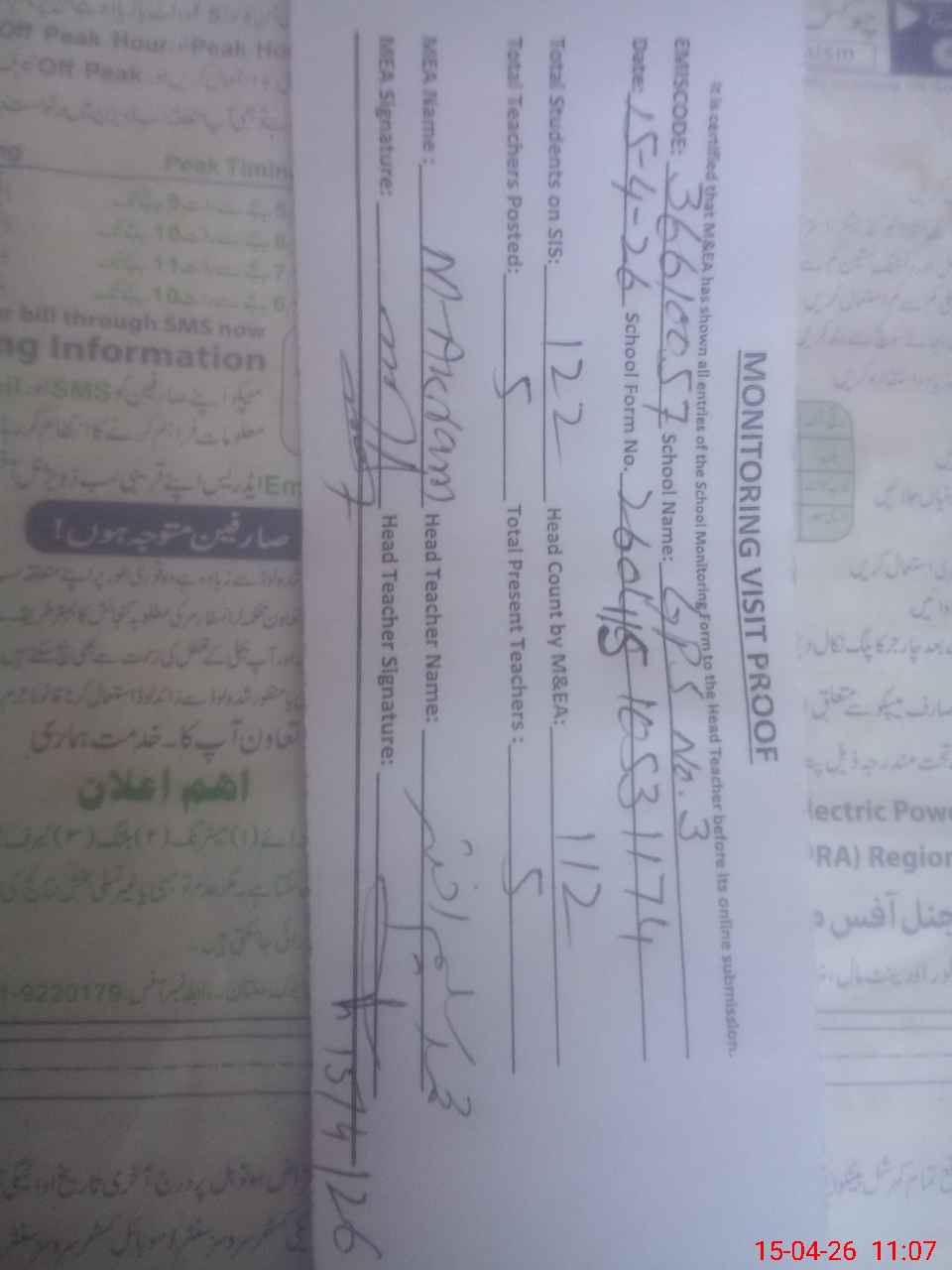 | Attendance Register | Head Teacher | MEA with School | Visit Proof |