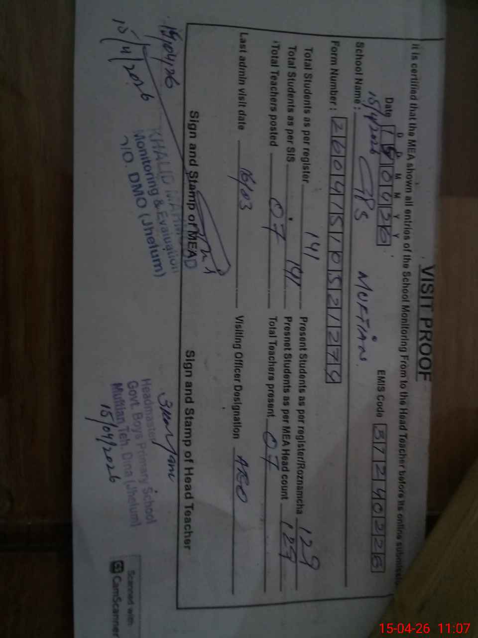 | Certified that this School was Inspected by the Undersigned MEA/DMO Today and the Information Stated Above is as Per Record. | |||||