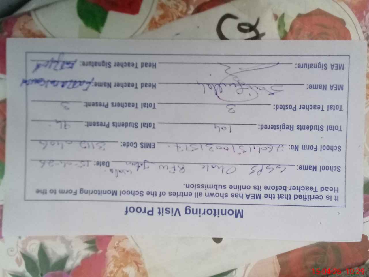 | Attendance Register | Head Teacher | MEA with School | Visit Proof |