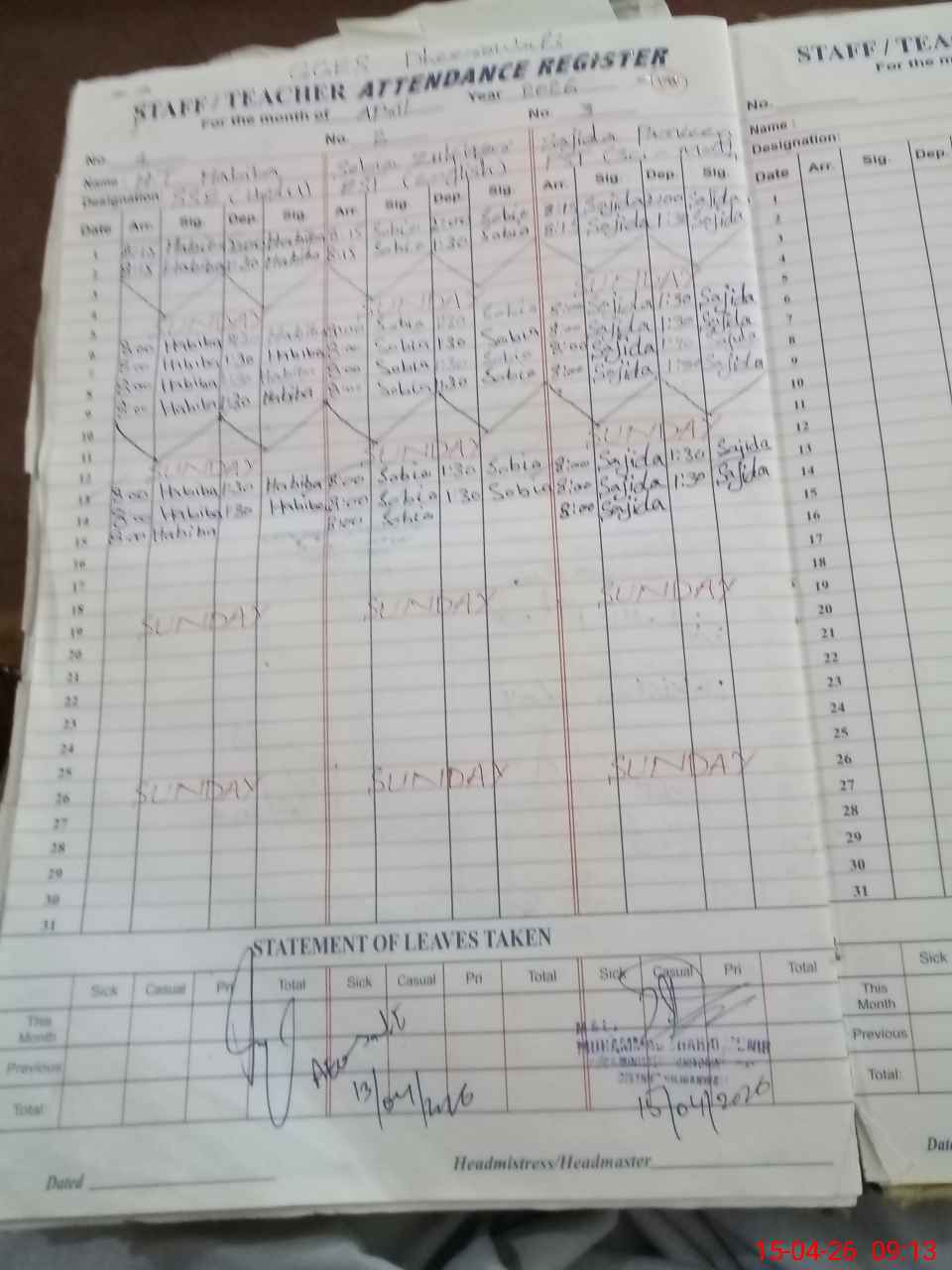 | CNIC | Full Name | Designation | R/C | Absence During Last Calender Month |