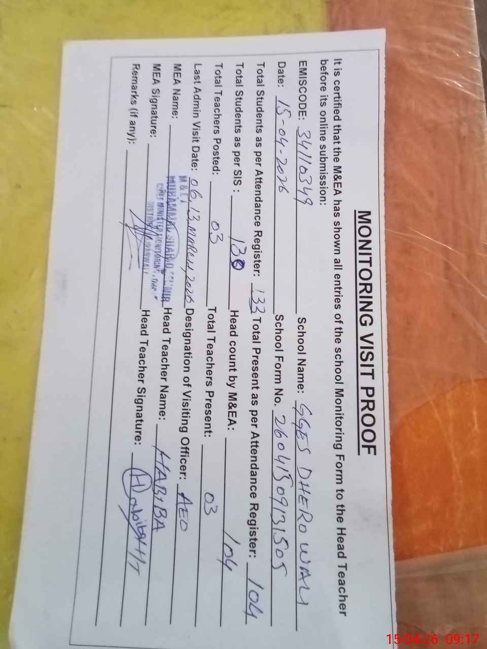 | Attendance Register | Head Teacher | MEA with School | Visit Proof |