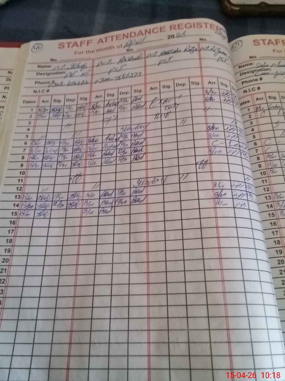 | CNIC | Full Name | Designation | R/C | Absence During Last Calender Month |