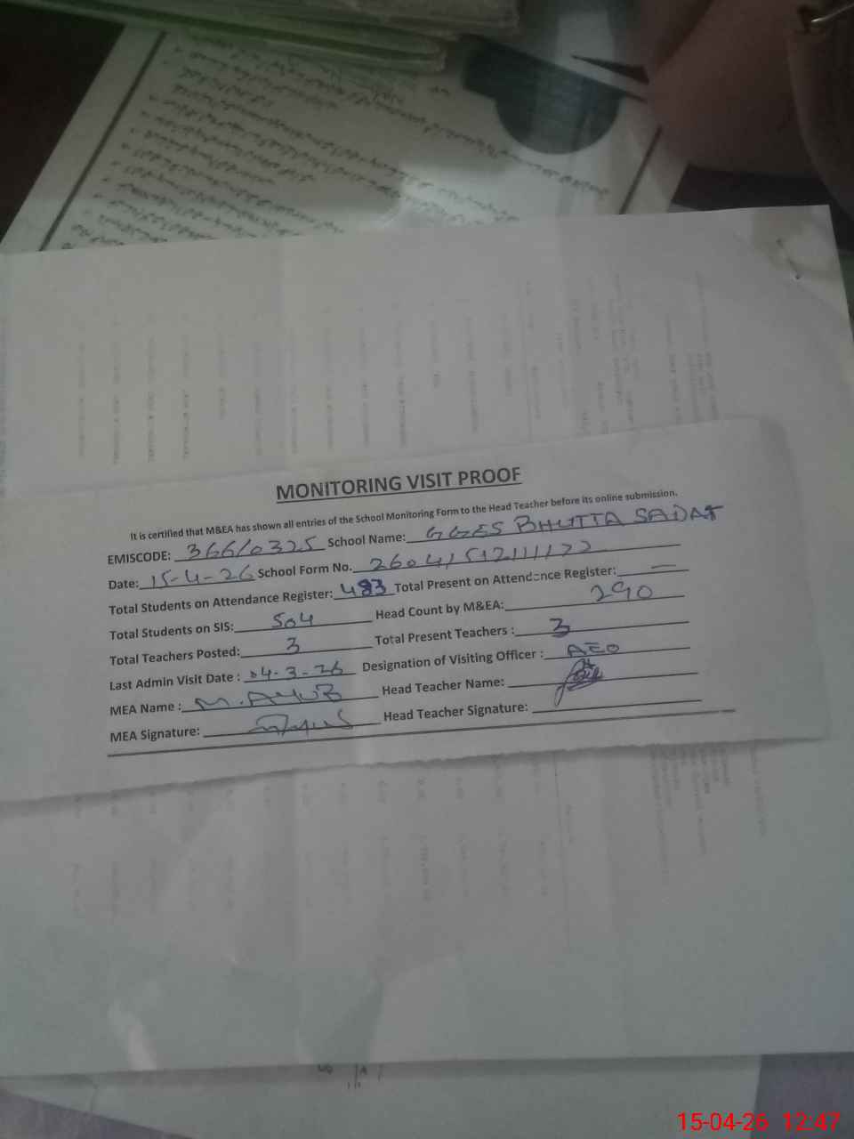 | Attendance Register | Head Teacher | MEA with School | Visit Proof |