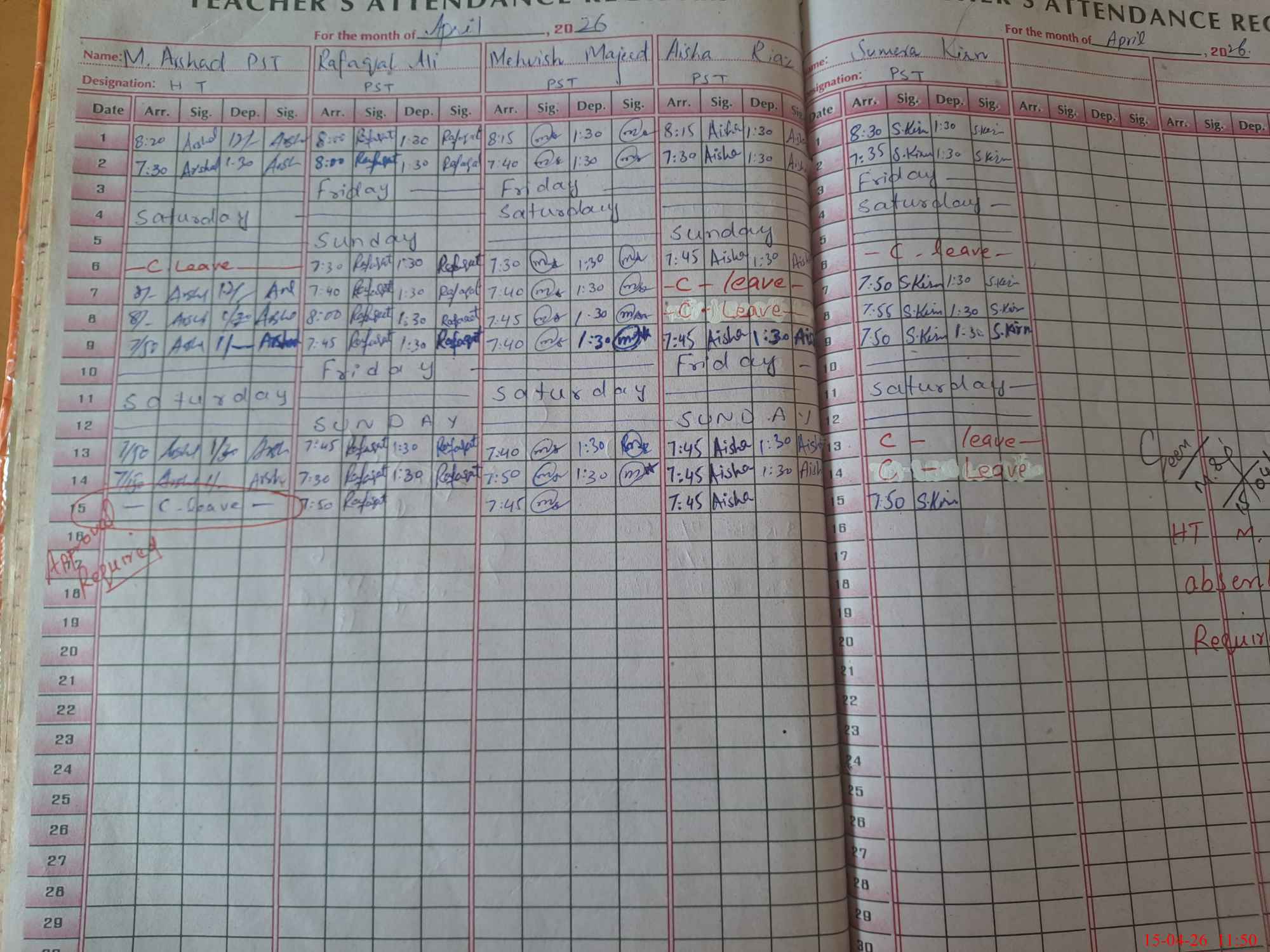 | CNIC | Full Name | Designation | R/C | Absence During Last Calender Month |