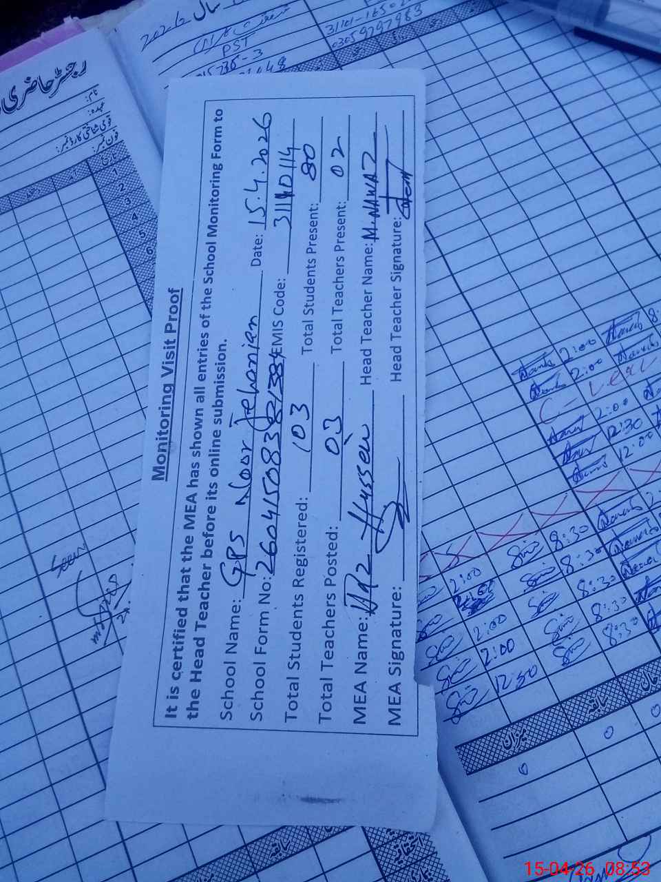 | Attendance Register | Head Teacher | MEA with School | Visit Proof |