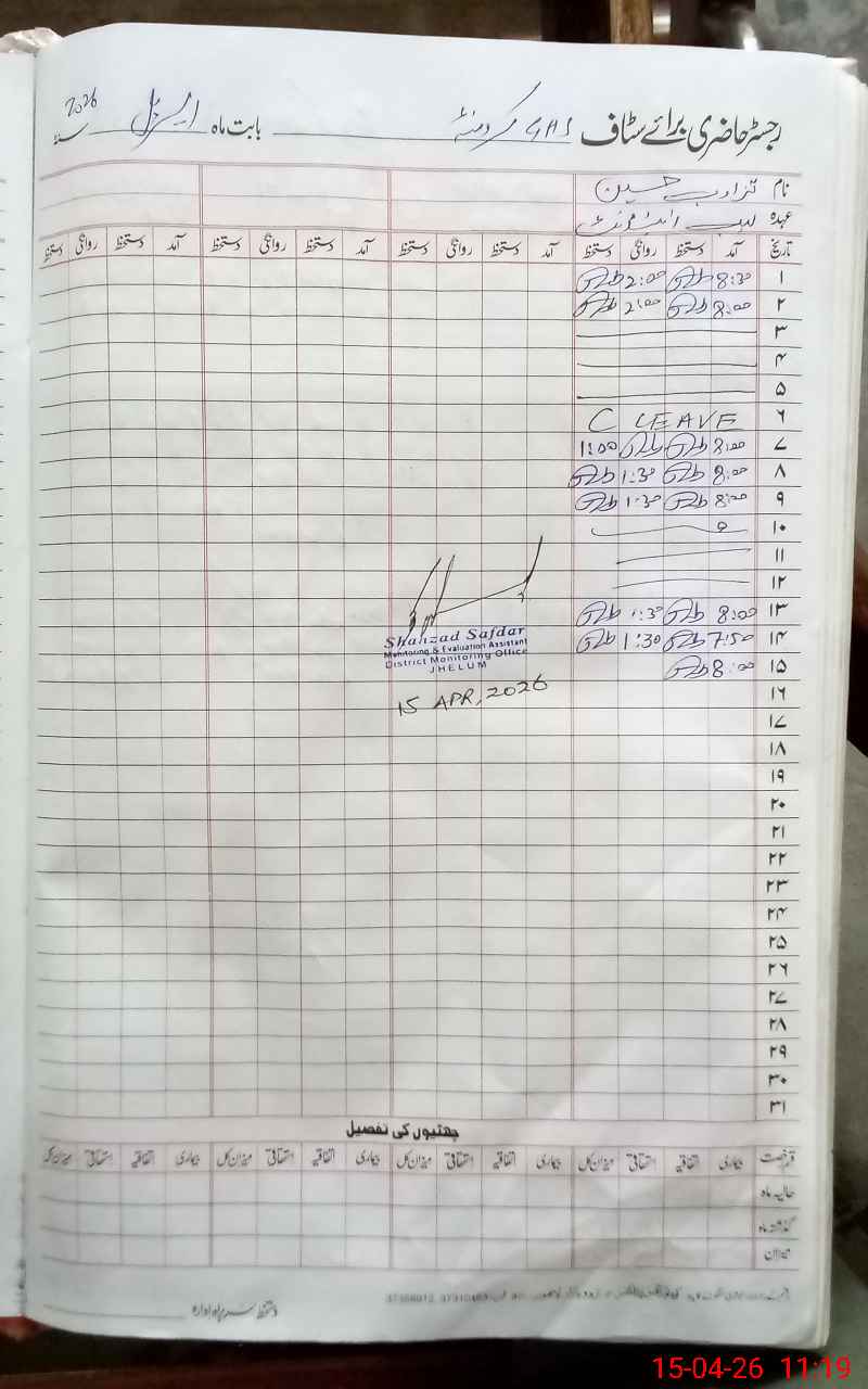 | CNIC | Full Name | Designation | R/C | Absence During Last Calender Month |