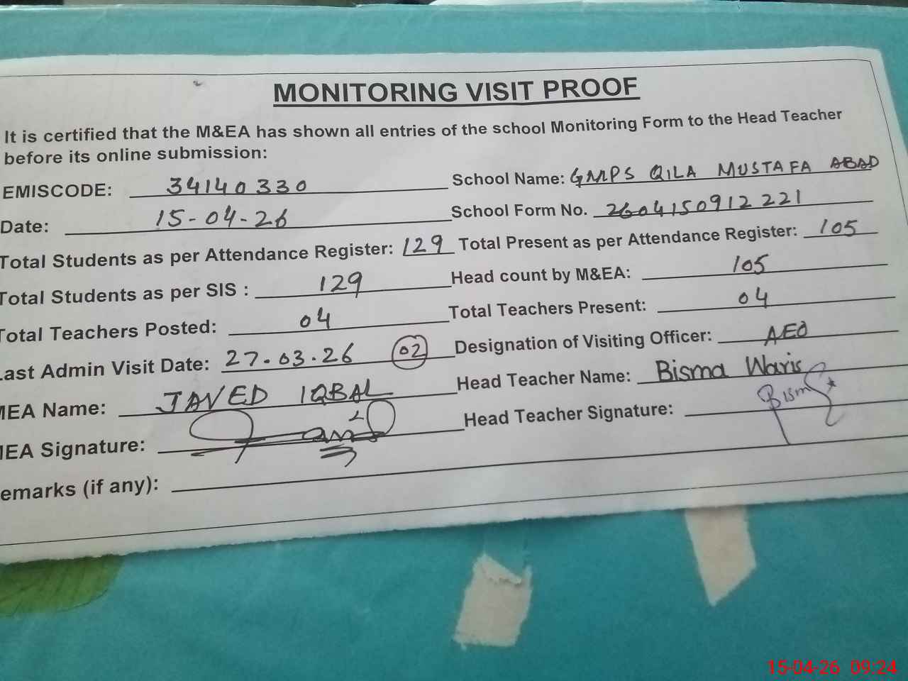| Attendance Register | Head Teacher | MEA with School | Visit Proof |
