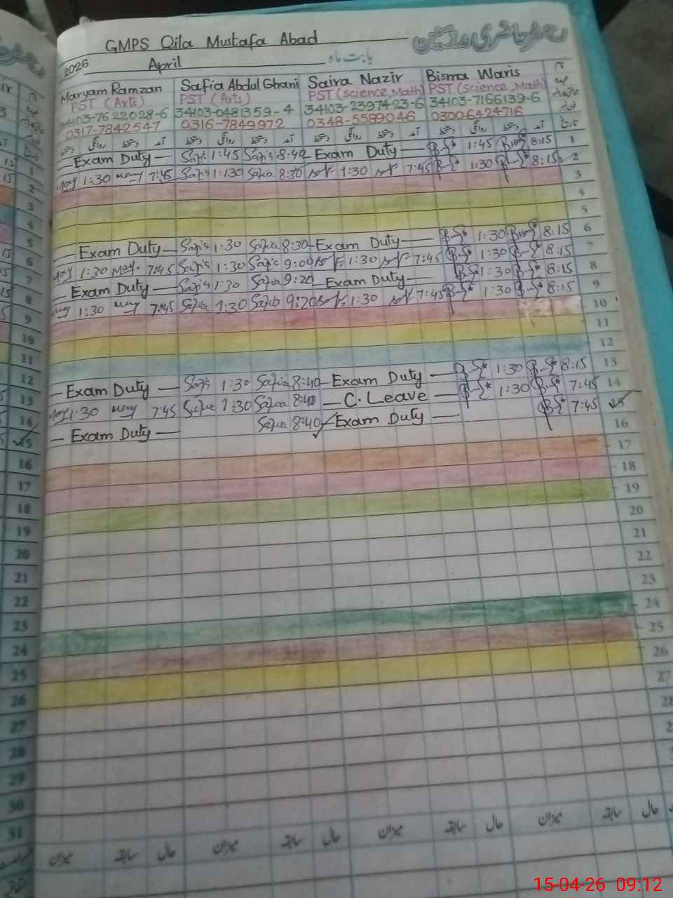 | Leave | Duty | Absent | Maternity | Medical | Ex- Pak |