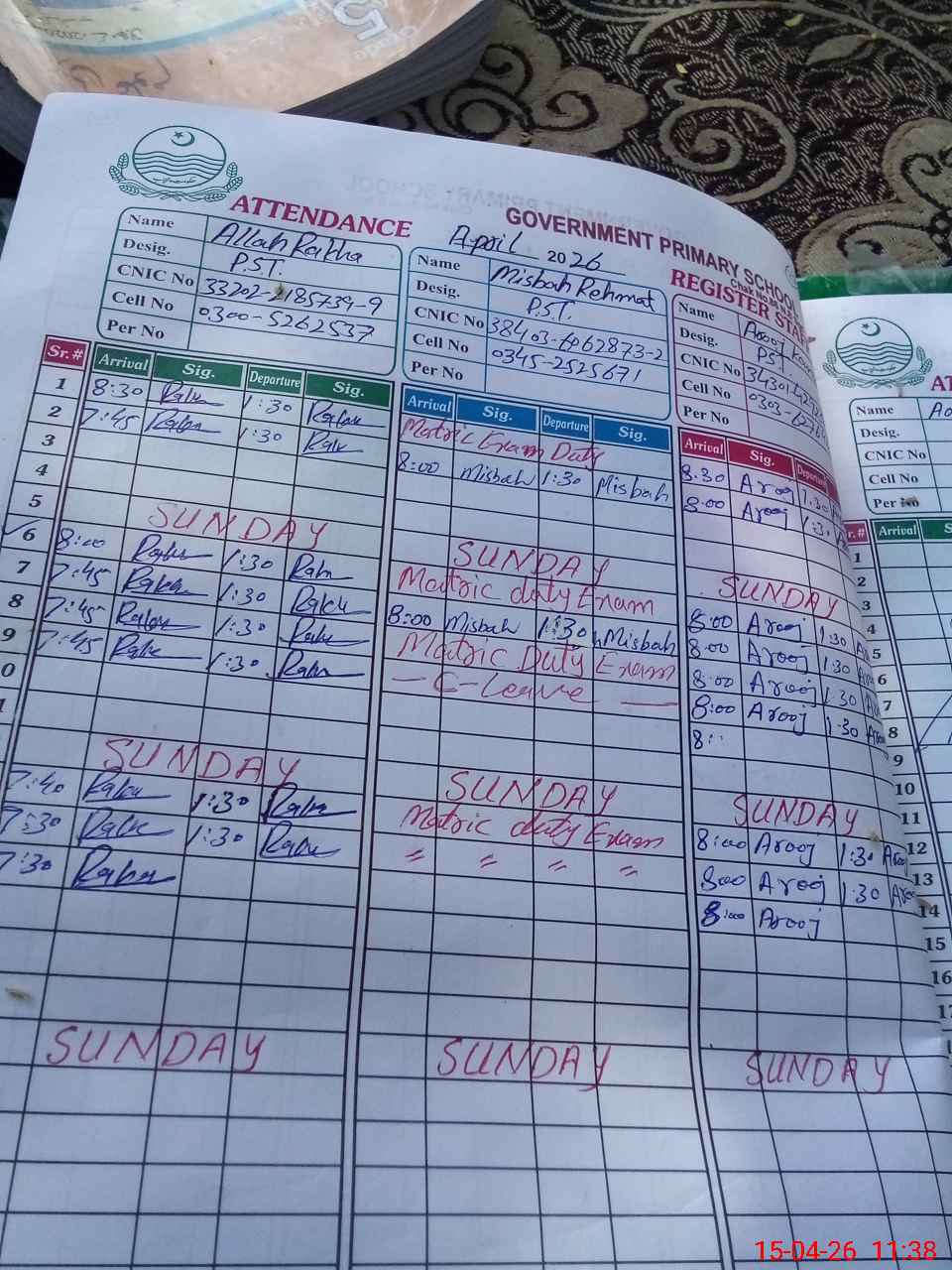 | CNIC | Full Name | Designation | R/C | Absence During Last Calender Month |