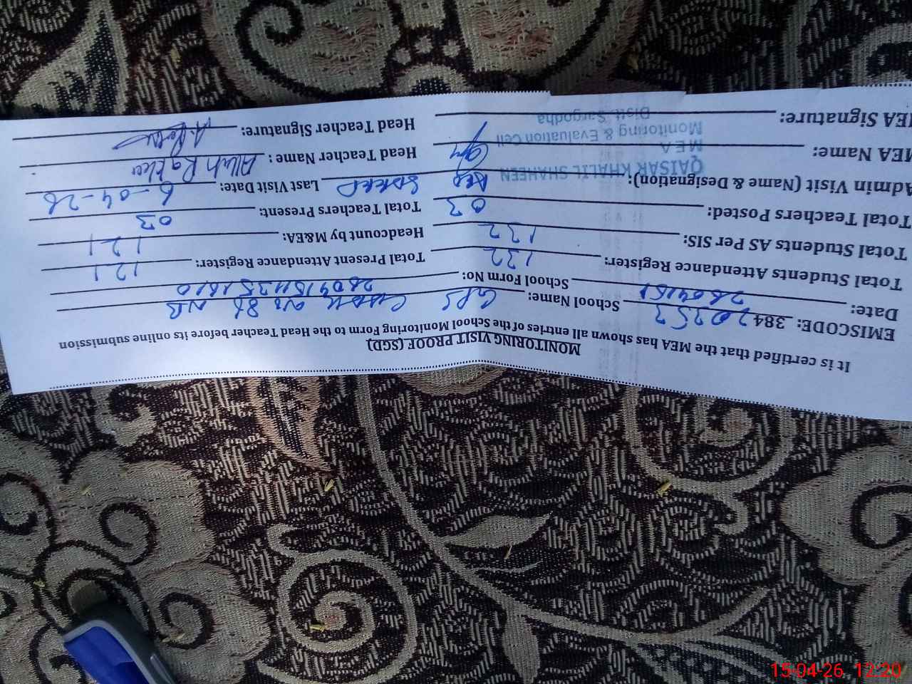 | Attendance Register | Head Teacher | MEA with School | Visit Proof |