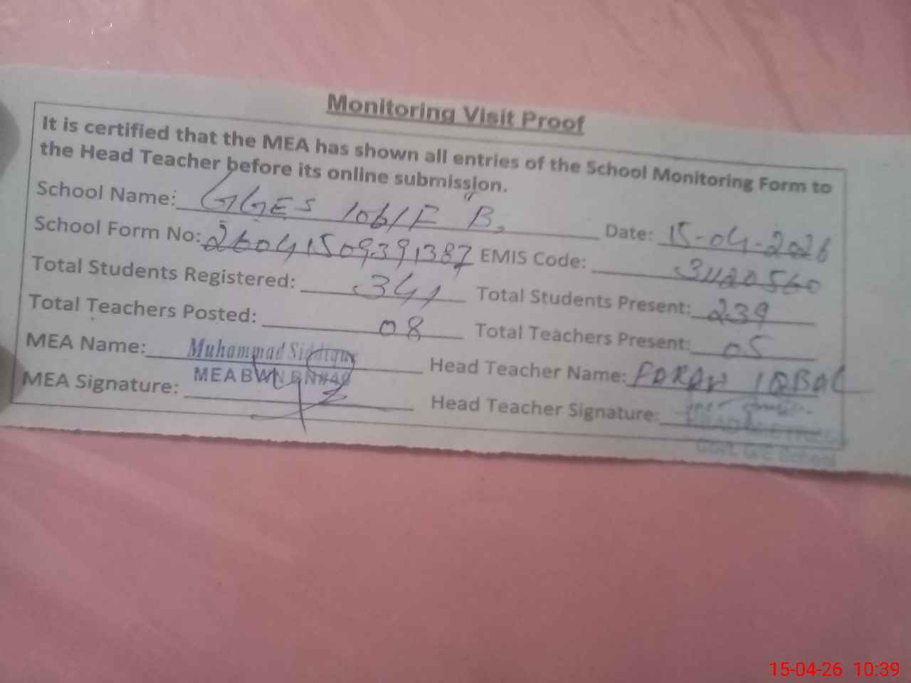 | Certified that this School was Inspected by the Undersigned MEA/DMO Today and the Information Stated Above is as Per Record. | |||||
