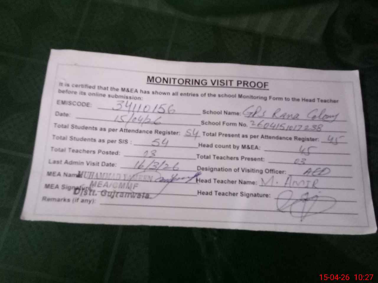 | Attendance Register | Head Teacher | MEA with School | Visit Proof |