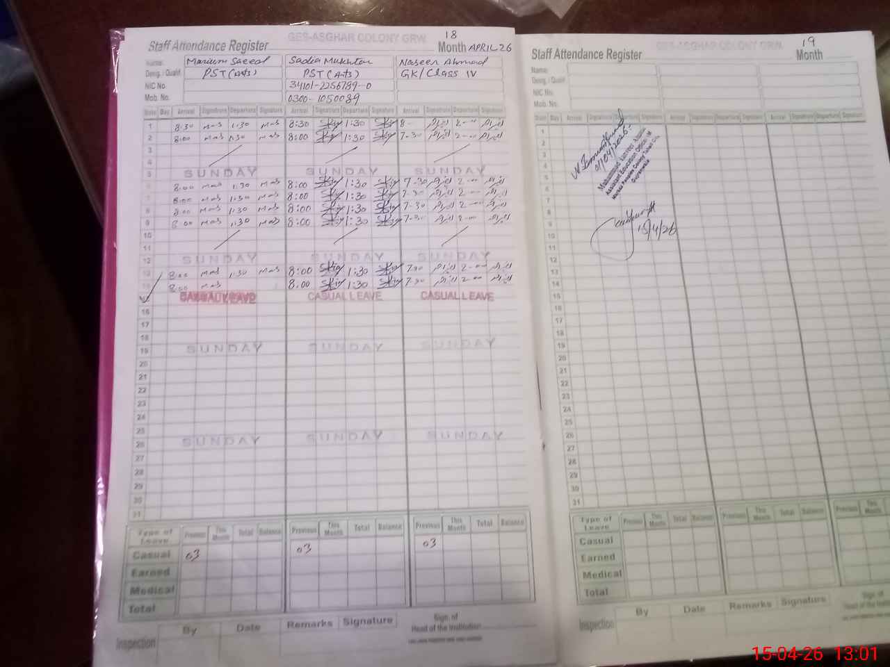 | CNIC | Full Name | Designation | R/C | Absence During Last Calender Month |