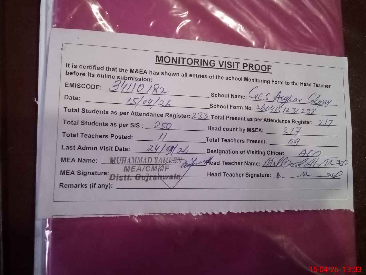 | Attendance Register | Head Teacher | MEA with School | Visit Proof |