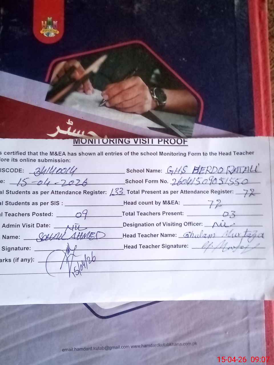 | Attendance Register | Head Teacher | MEA with School | Visit Proof |