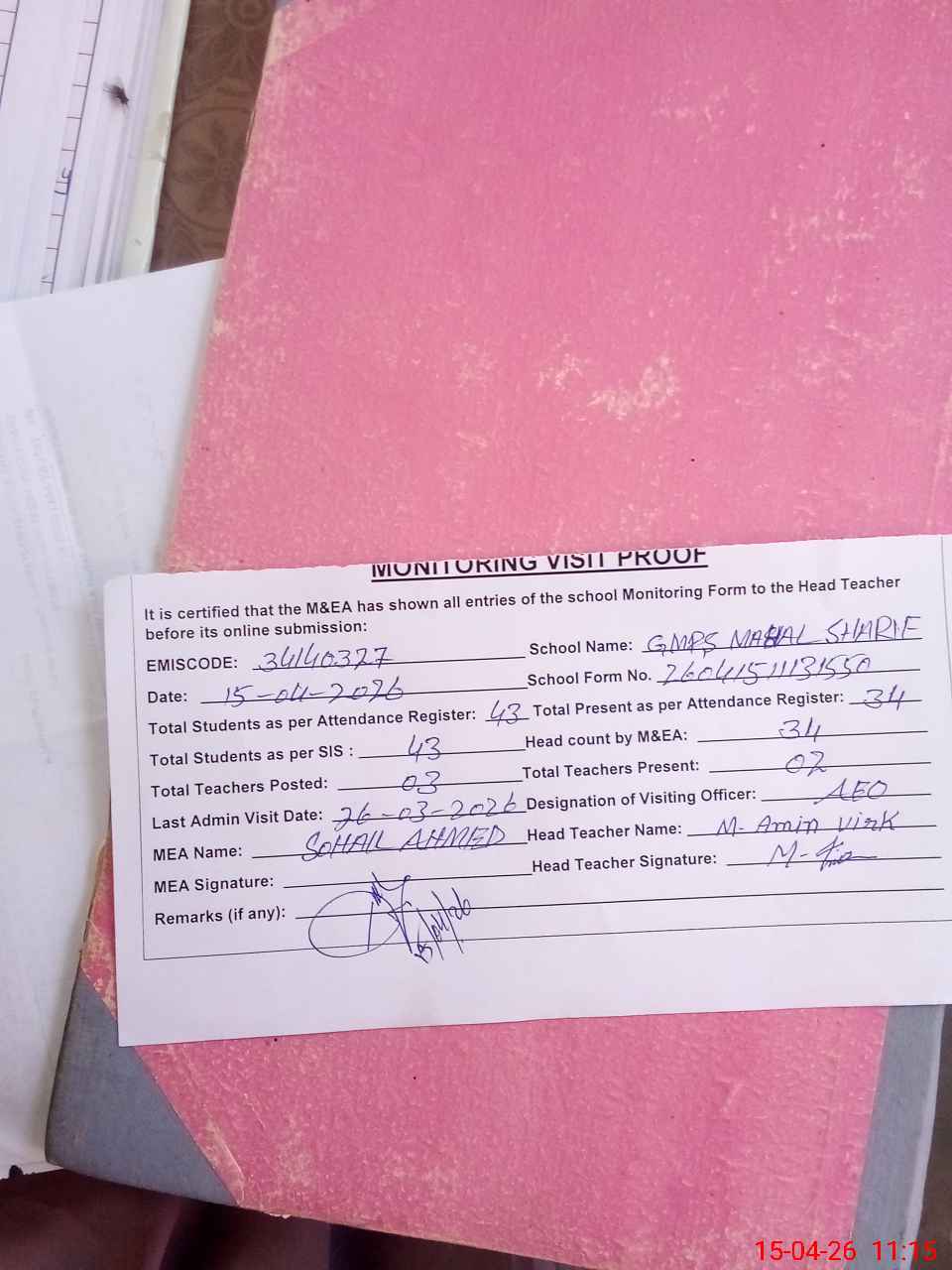 | Attendance Register | Head Teacher | MEA with School | Visit Proof |
