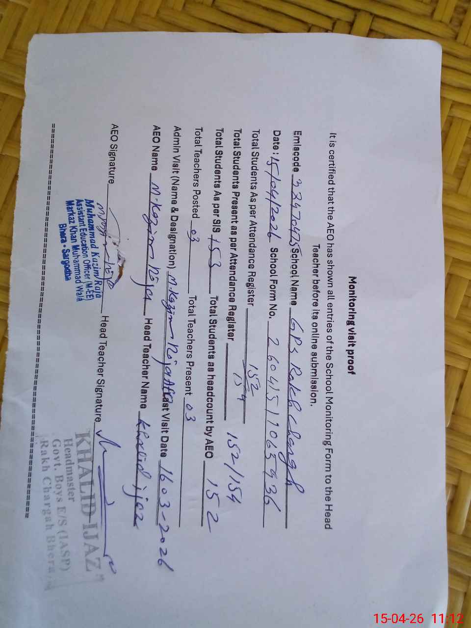 | Name: Kh**** Ij**** Designation: (School Headmaster's/Headmistress's) PST Phone/Cell Number: 03**** |