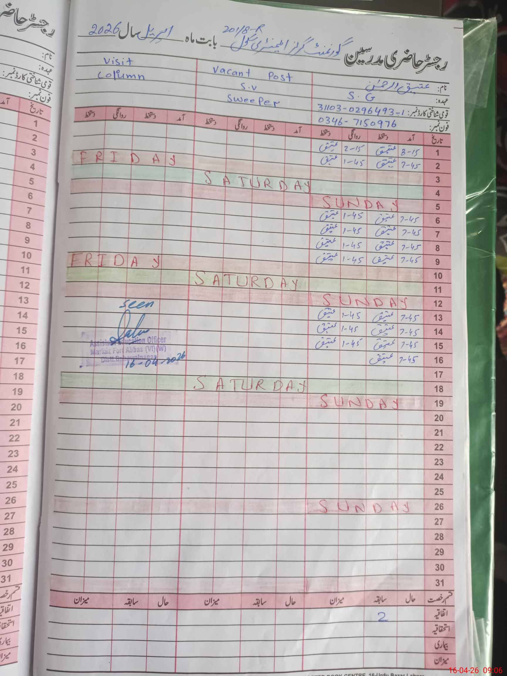 | Name: SA**** AL**** Designation: (School Headmaster's/Headmistress's) S.S.T.(Arts) Phone/Cell Number: 03**** |