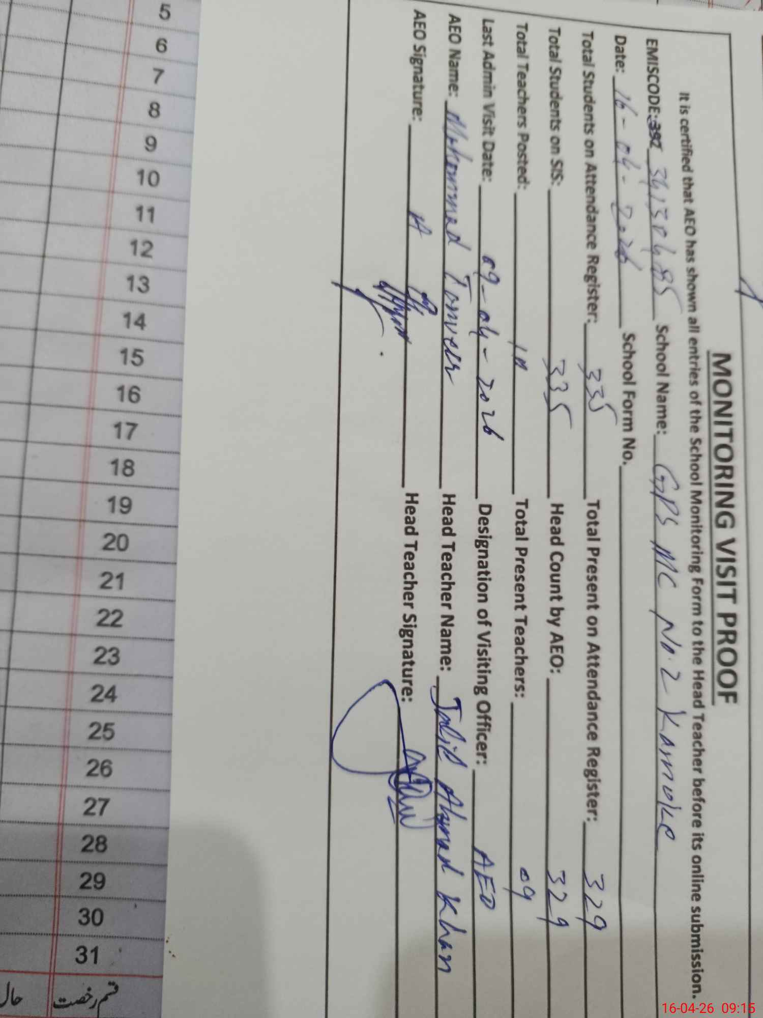 | Attendance Register | Head Teacher | MEA with School | Visit Proof |