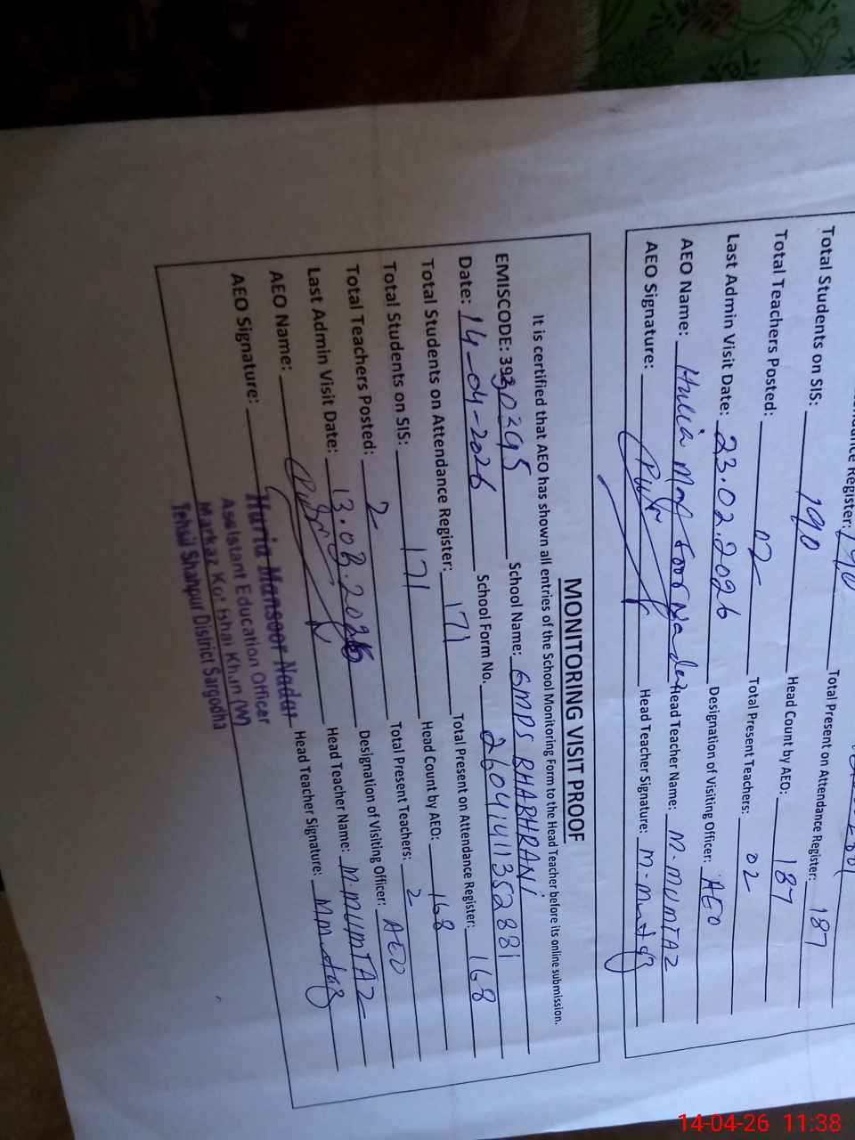 | Certified that this School was Inspected by the Undersigned MEA/DMO Today and the Information Stated Above is as Per Record. | |||||