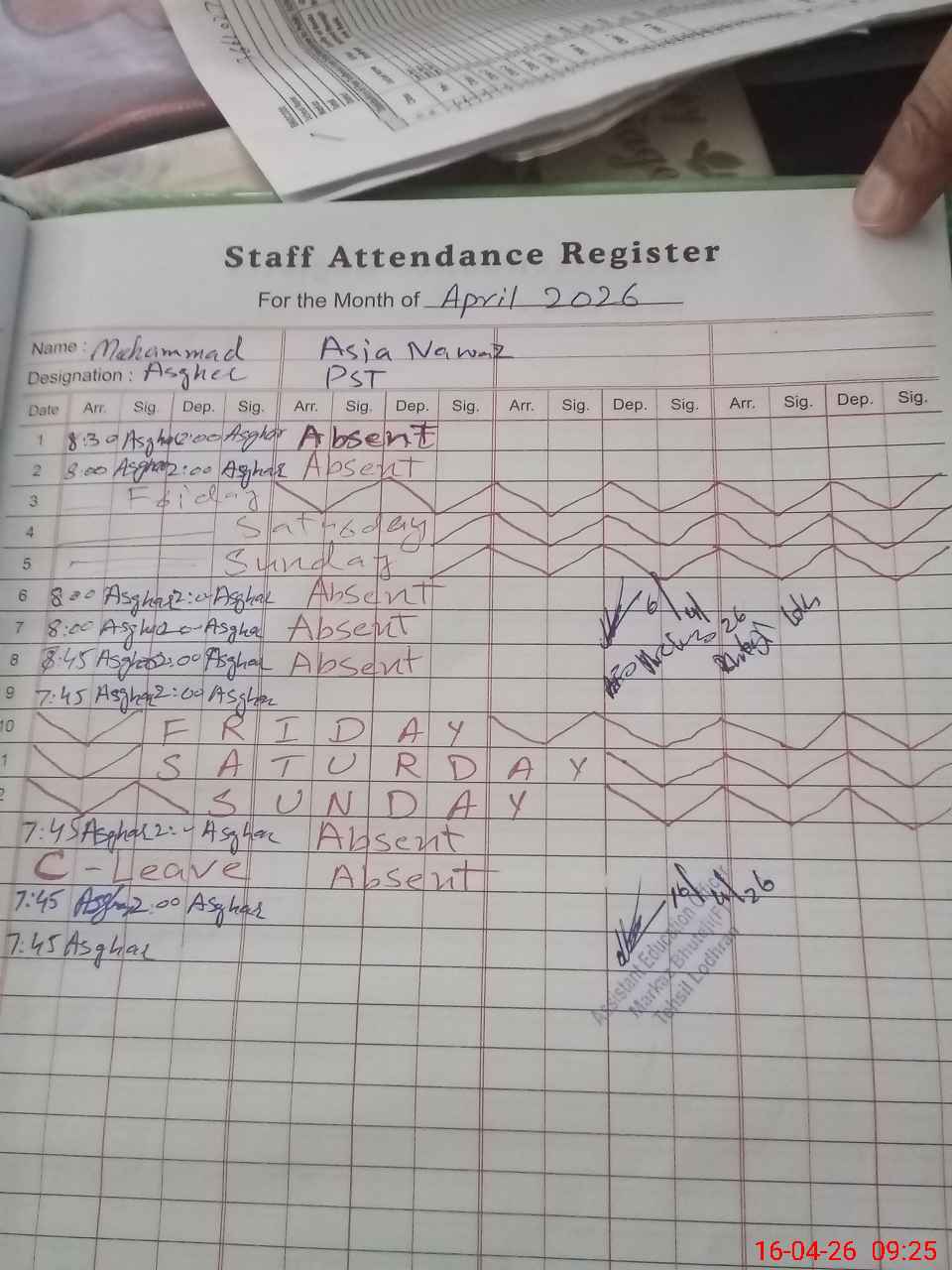 | 61**** | Iq**** Ay**** Ra**** | PST Science/Maths | Regular | 0 | 0 | 0 | 0 | 0 | 0 | 0 | 0 | 0 | Exam Duty |