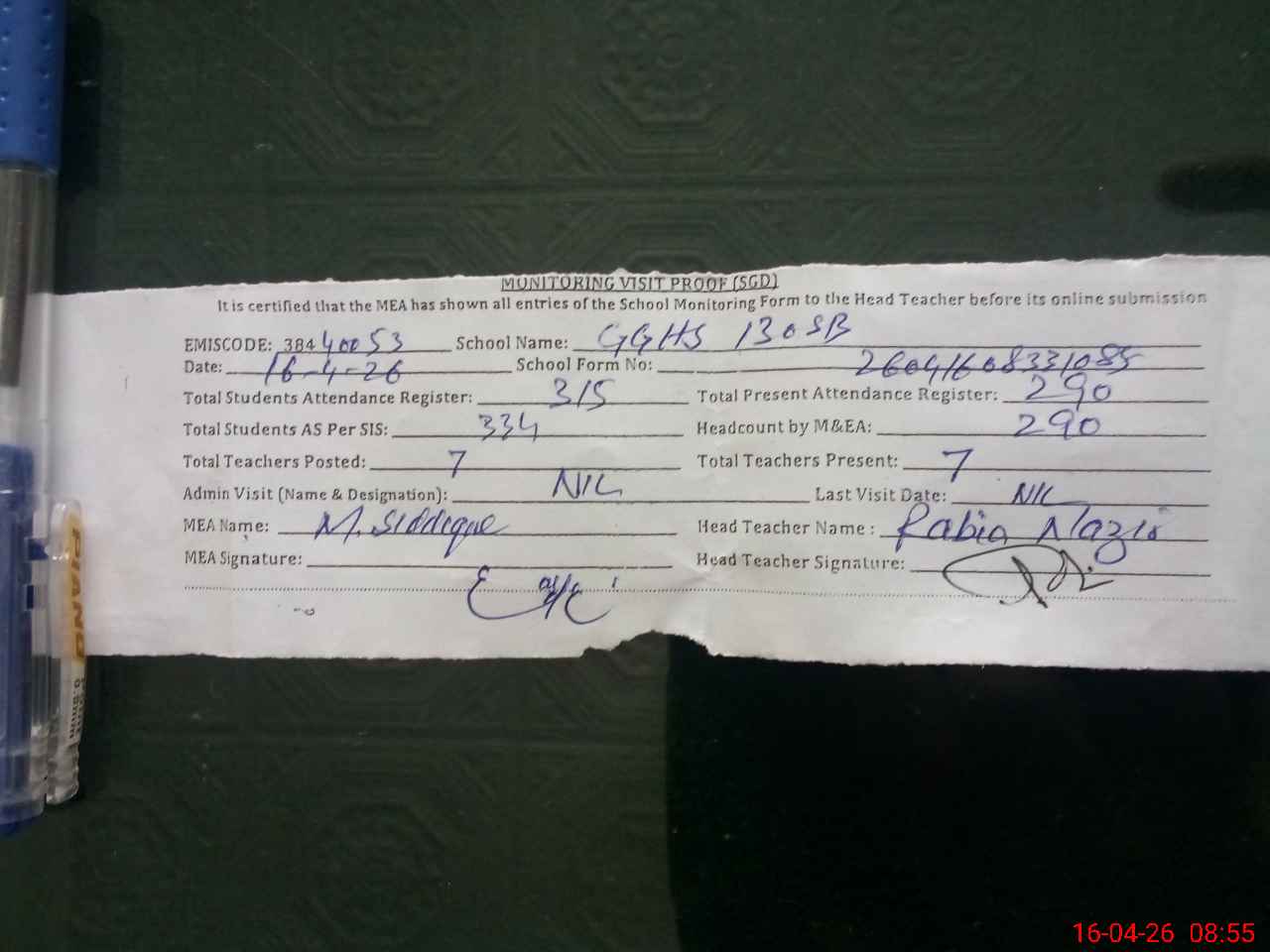 | Attendance Register | Head Teacher | MEA with School | Visit Proof |
