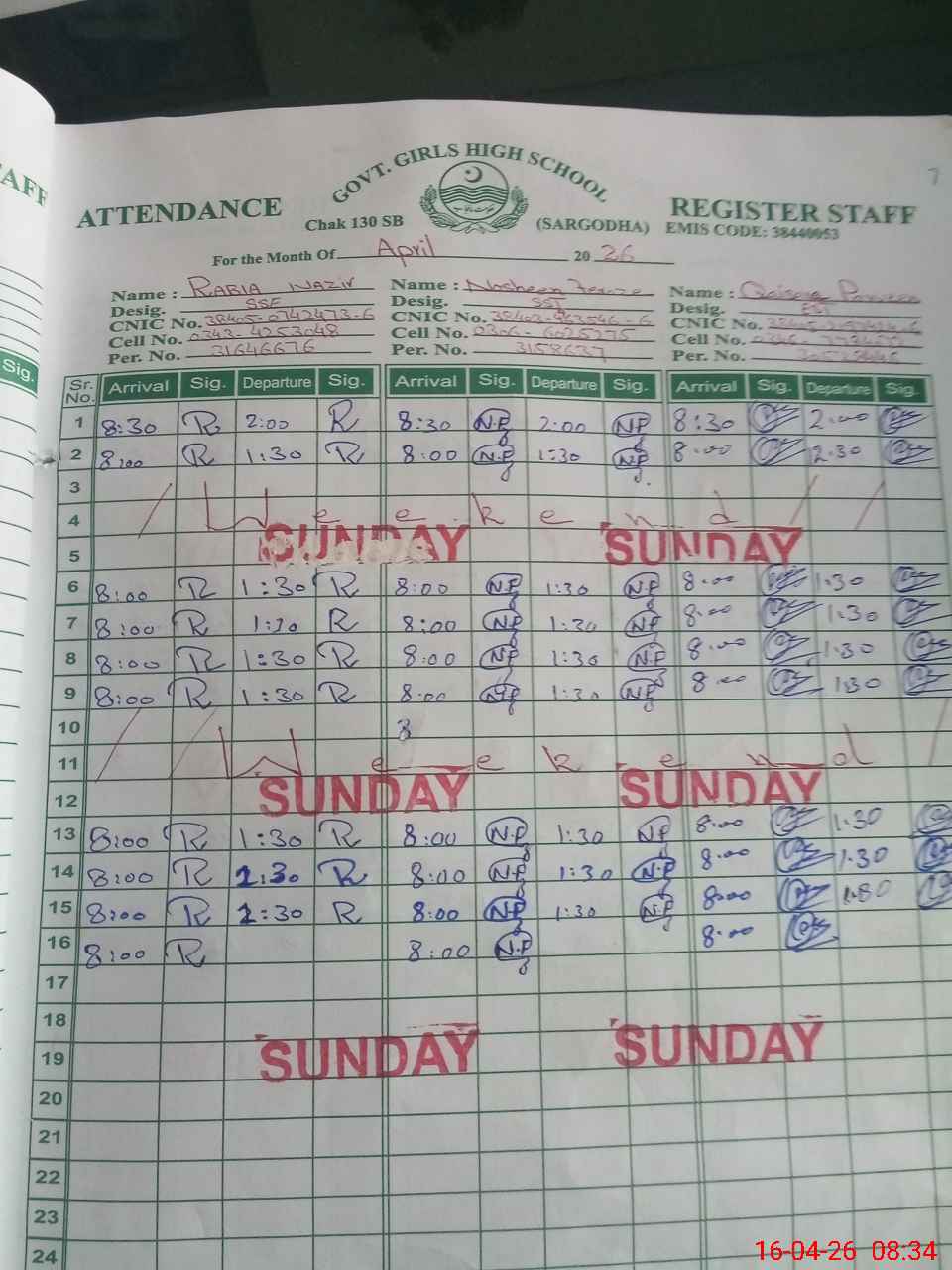 | CNIC | Full Name | Designation | R/C | Absence during last cal. month |