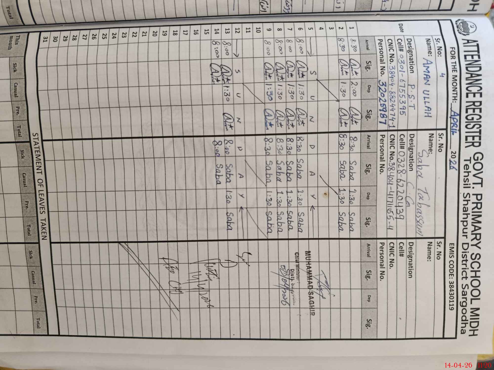 | CNIC | Full Name | Designation | R/C | Absence During Last Calender Month |