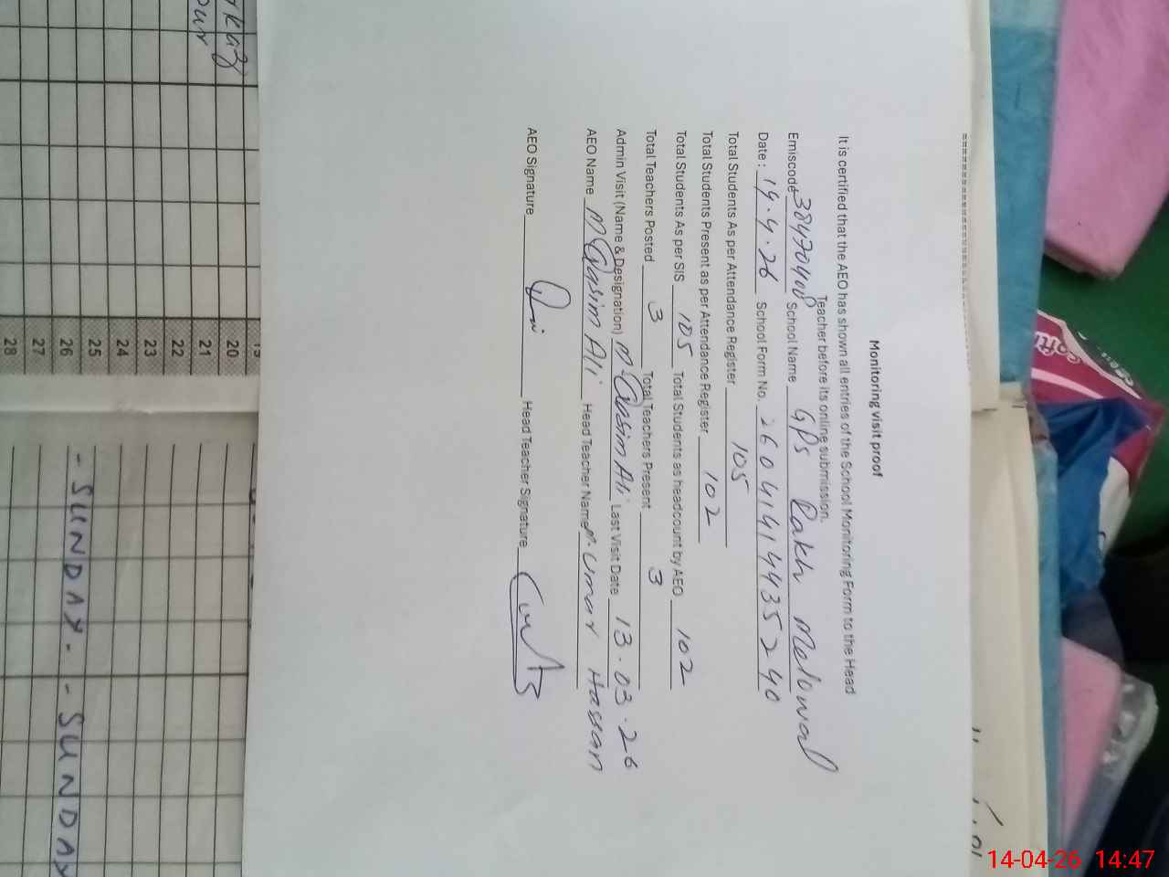 | Attendance Register | Head Teacher | MEA with School | Visit Proof |