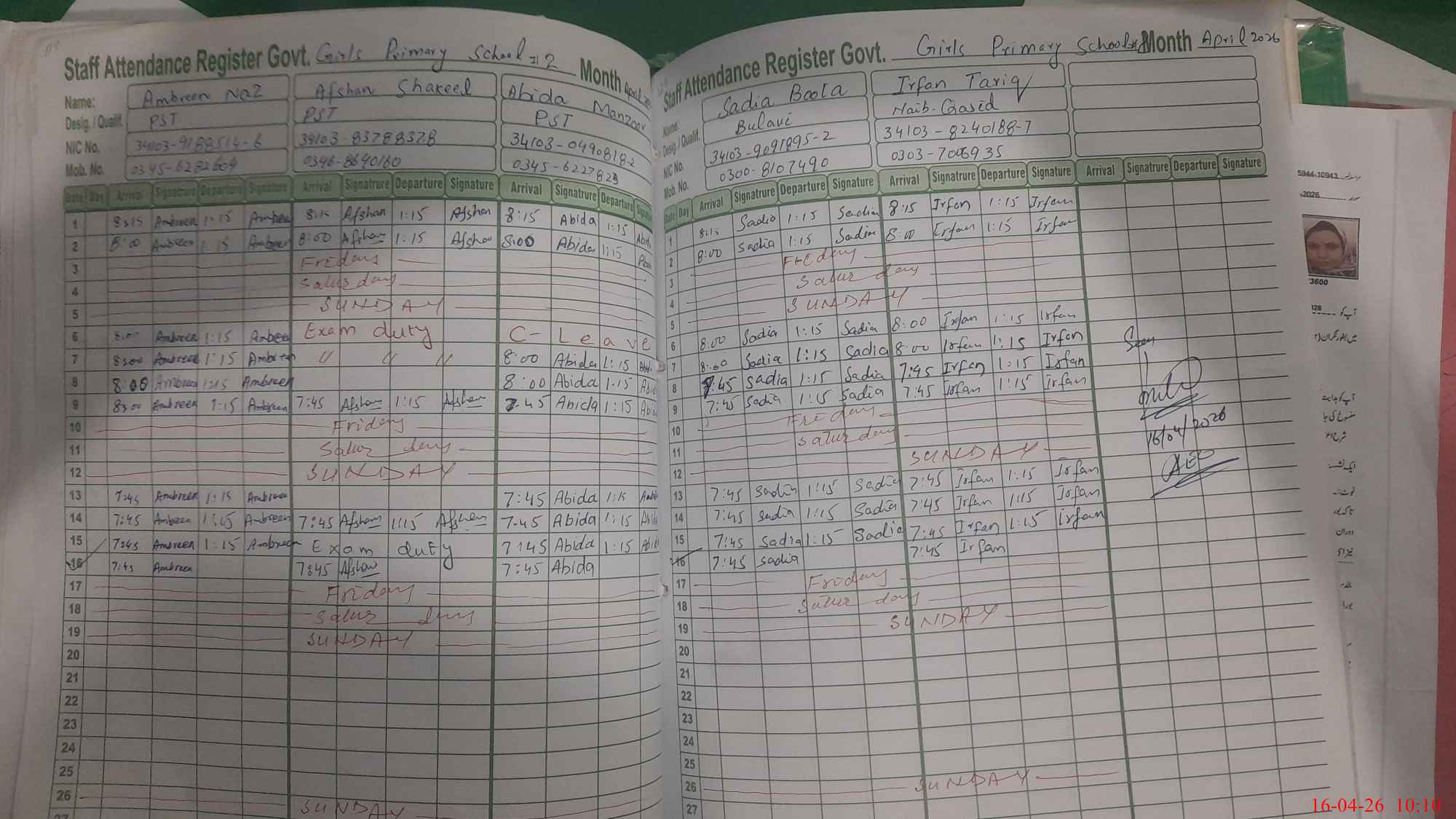 | CNIC | Full Name | Designation | R/C | Absence During Last Calender Month |