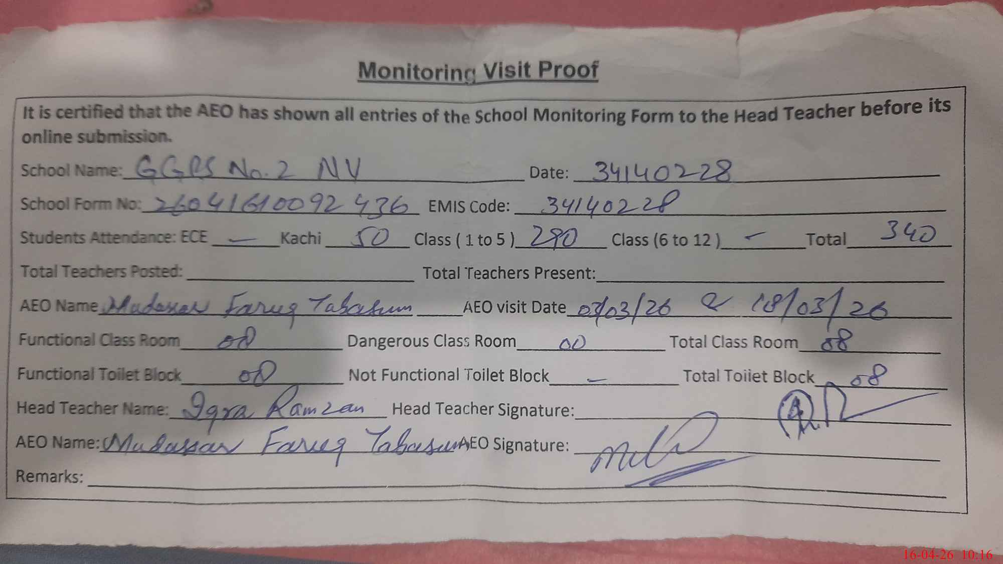 | Certified that this School was Inspected by the Undersigned MEA/DMO Today and the Information Stated Above is as Per Record. | |||||