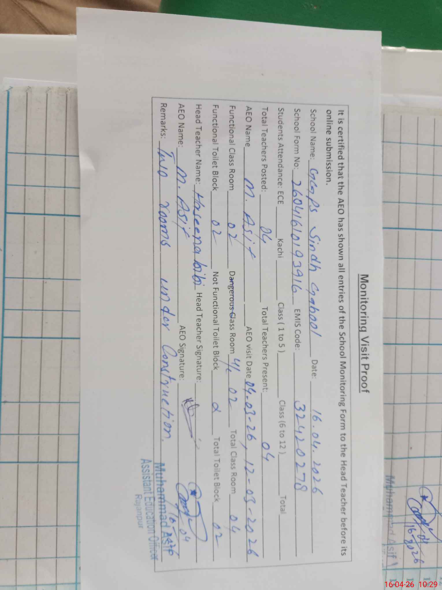 | Certified that this School was Inspected by the Undersigned MEA/DMO Today and the Information Stated Above is as Per Record. | |||||