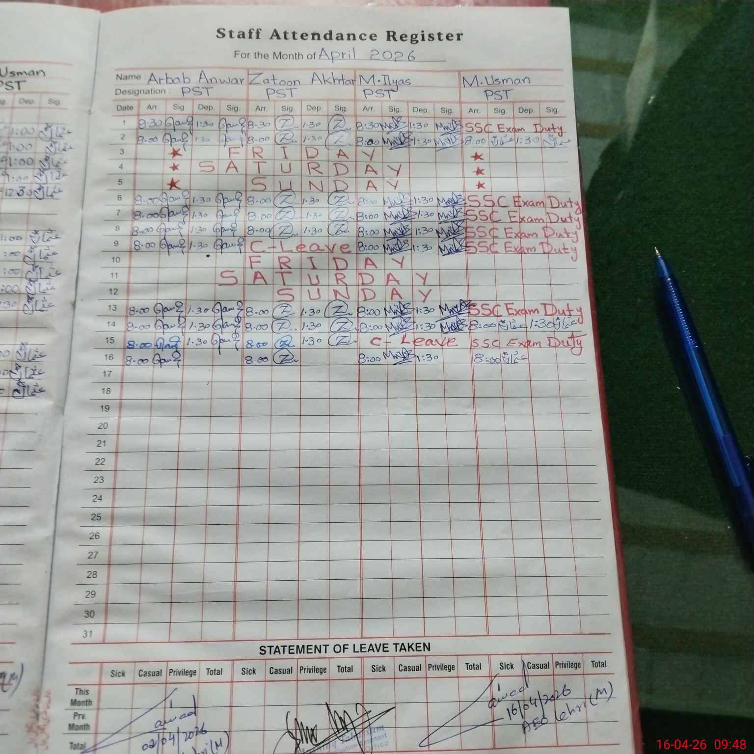 | Leave | Duty | Absent | Maternity | Medical | Ex- Pak |