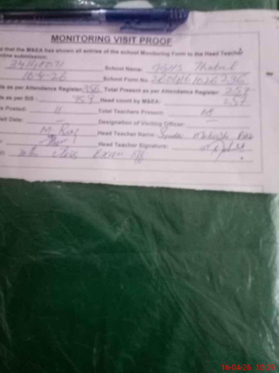 | Attendance Register | Head Teacher | MEA with School | Visit Proof |